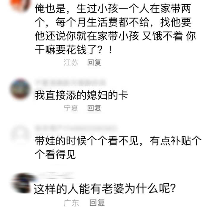 近日,一丈夫让妻子把领导的育儿补贴转给他用来还账,引妻子不满:孩子的补贴钱都惦记!